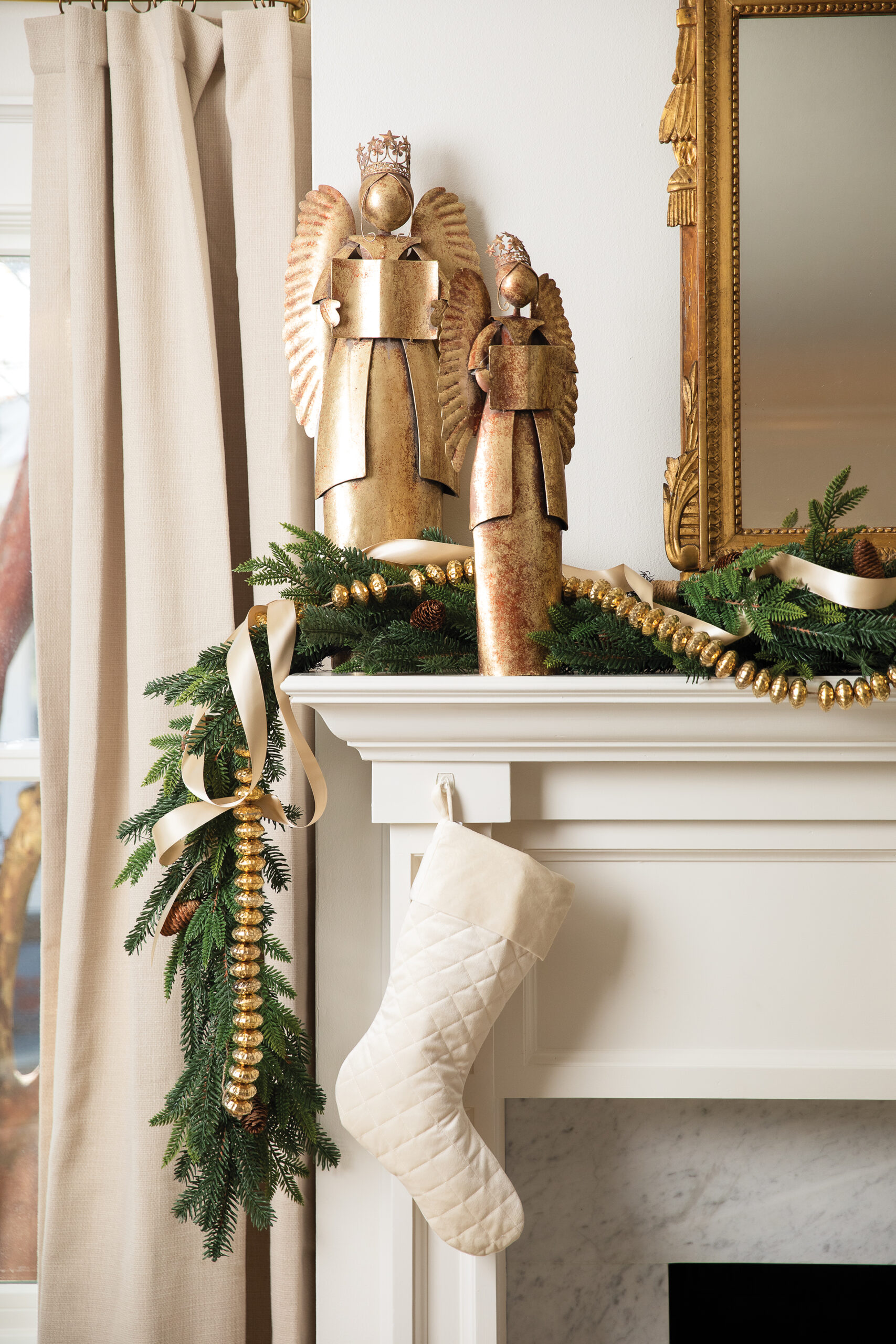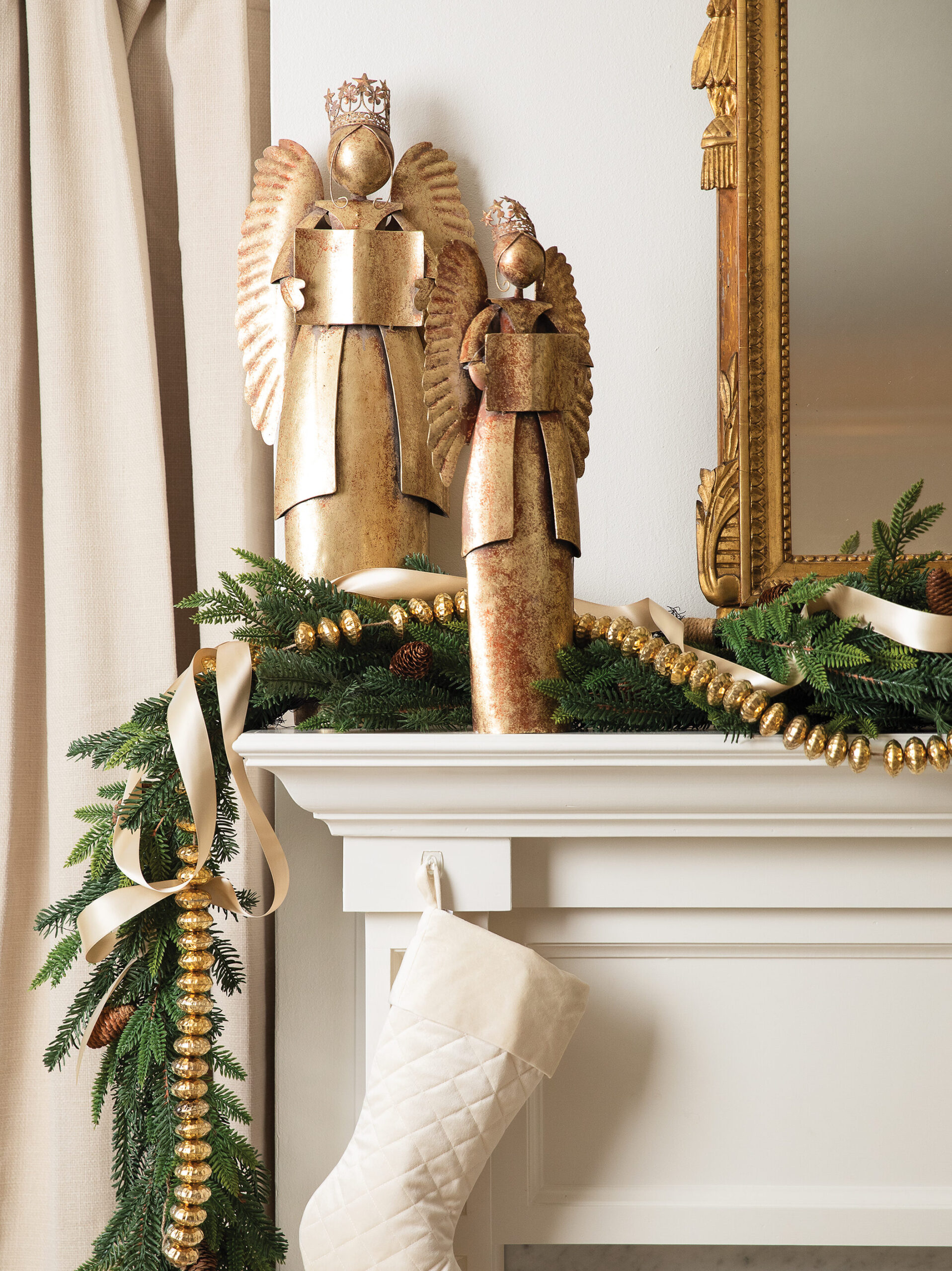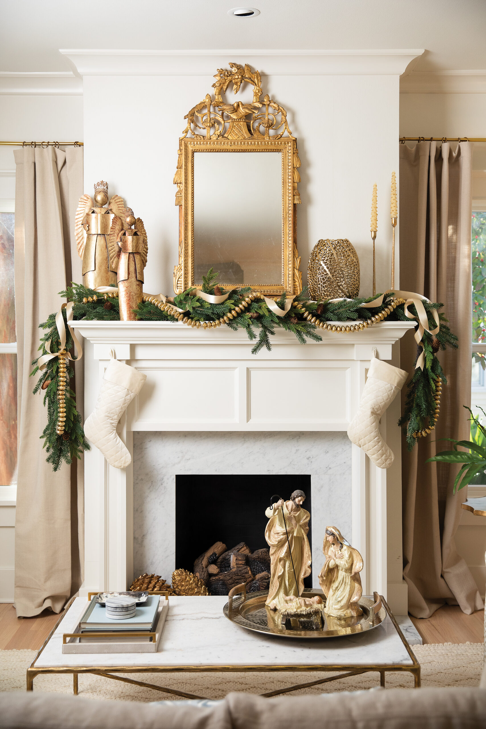 A Nativity set highlighted in resplendent gold sets the tone for this traditional mantel décor. Above the mantel, an antique 19th century French gilt bridal mirror is surrounded by gilded metallic angels, a contemporary vase, and candlesticks in varied heights. The mantel is draped with faux evergreen garlands and a necklace like gold jingling garland. Cream velvet stockings are hung with care, and large gilded pinecones add interest to the hearth.