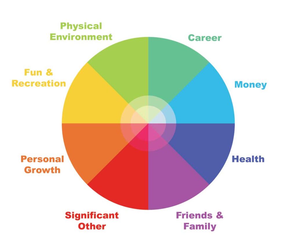 1. Do a Life Audit.  I usually do this step on January 1st, but I think it’s a great tool to use at the beginning of EVERY month!  A life audit helps you figure out what’s working and what’s not. My favorite tool to conduct a life audit is the “Wheel of Life.” It looks like this.