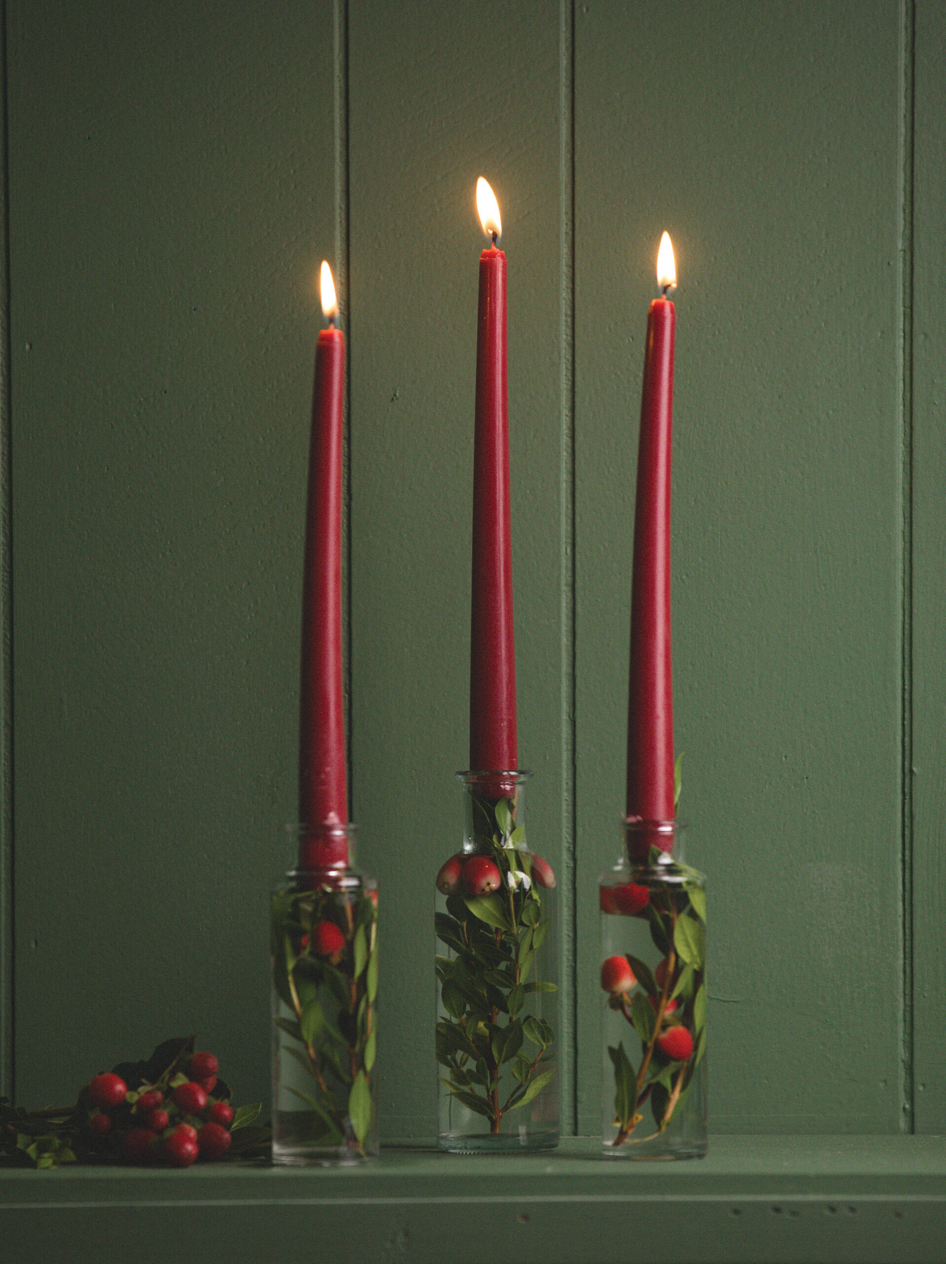 Styled by Kate Ashley | Photography by Kelly Moore Clark Upcycling glass bottles into candleholders is a simple and charming way to give discarded items new life. DIRECTIONS: This craft is quick and easy. First, stuff in holly or greenery to glass bottles. A lot of bottle necks are a perfect fit fo...