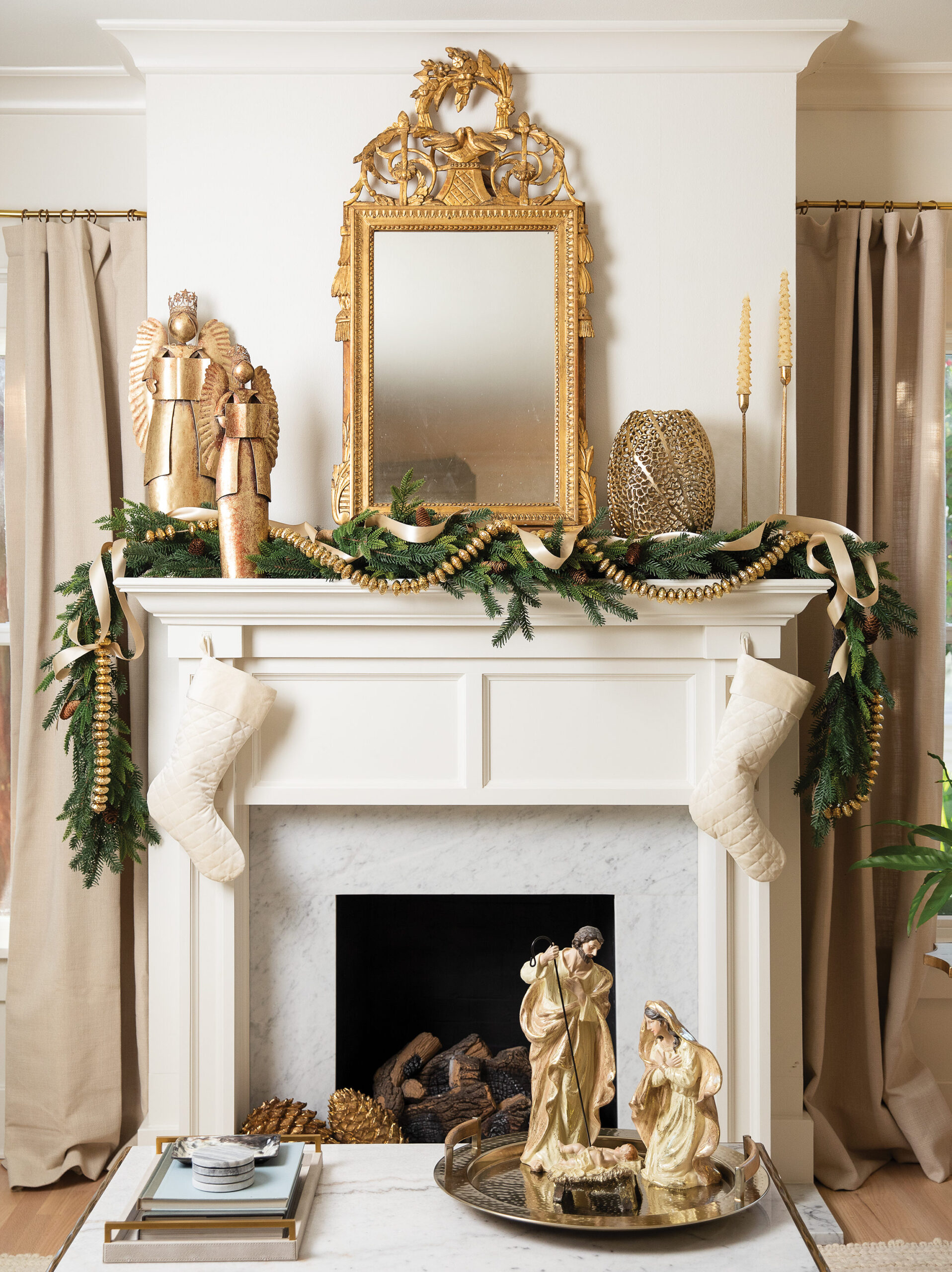 Styled by Maré Brennan | Photography by Kelly Moore Clark A Nativity set highlighted in resplendent gold sets the tone for this traditional mantel décor. Above the mantel, an antique 19th century French gilt bridal mirror is surrounded by gilded metallic angels, a contemporary vase, and candlestick...