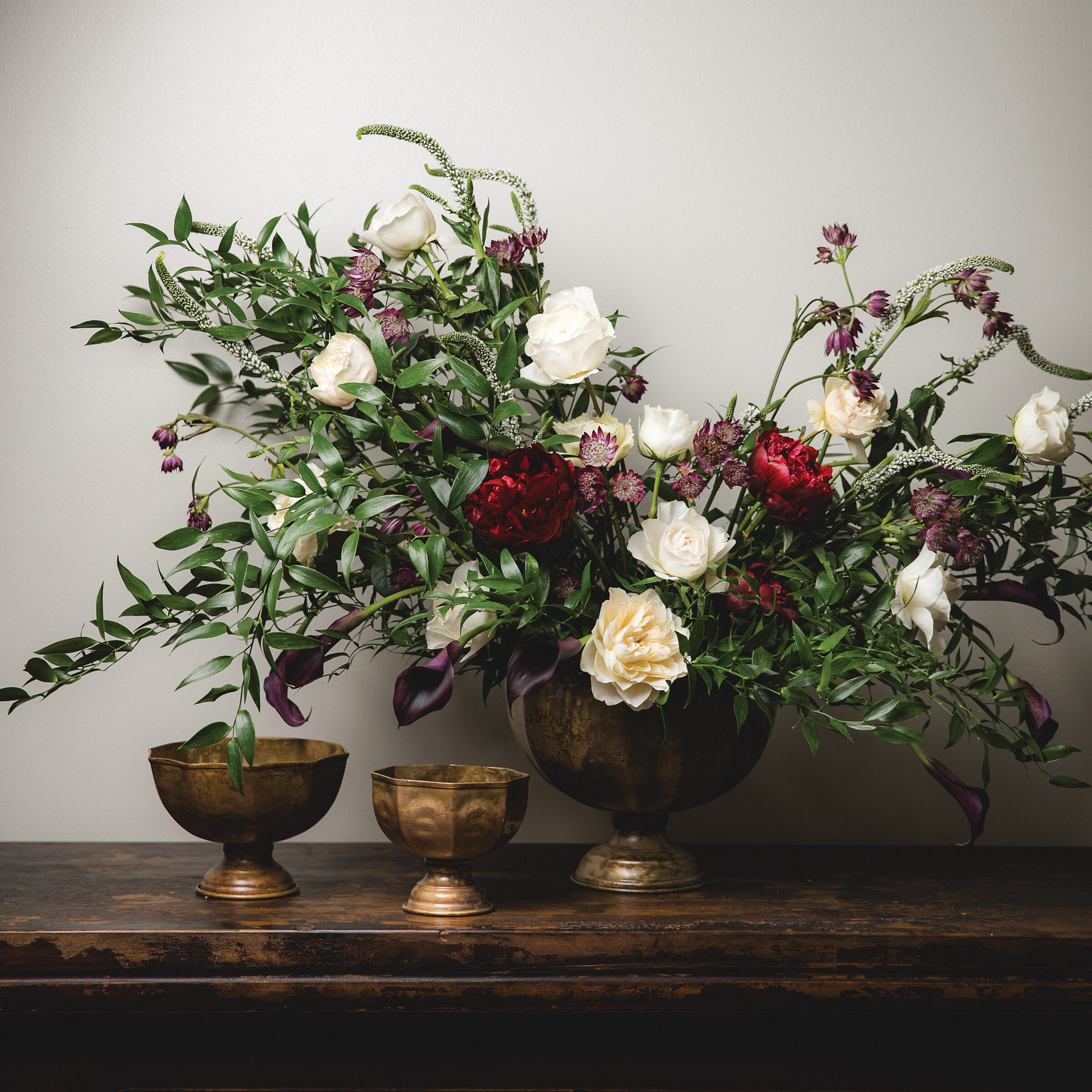Styled by Maré Brennan | Photography by Kelly Moore Clark Set the tone for a chic New Year celebration with a floral arrangement filled with fragrant Black Beauty peonies, exuberant White Cloud roses, dark purple mini calla lilies and star bursts of Astrantia clusters along with spires of white ver...