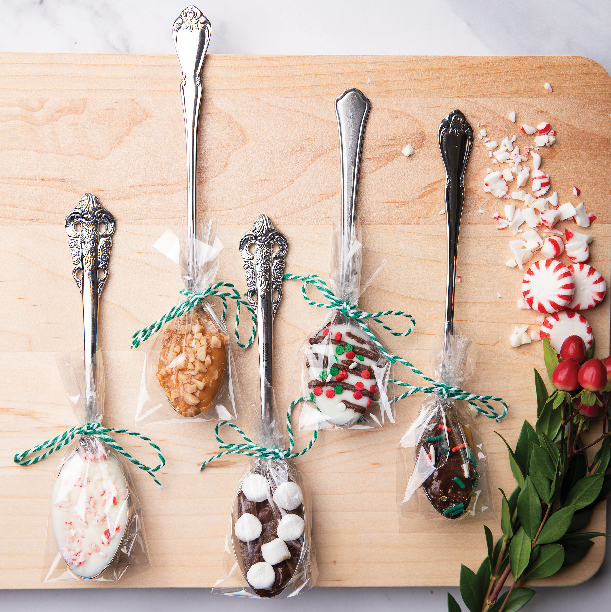 Styled by Kate Ashley | Photography by Kelly Moore Clark We love giving unique gifts for Christmas, and these cocoa spoons are a perfect example. Melted chocolate and festive toppings transform random antique silver flatware into charming, memorable treats. DIRECTIONS: Microwave the semisweet choco...