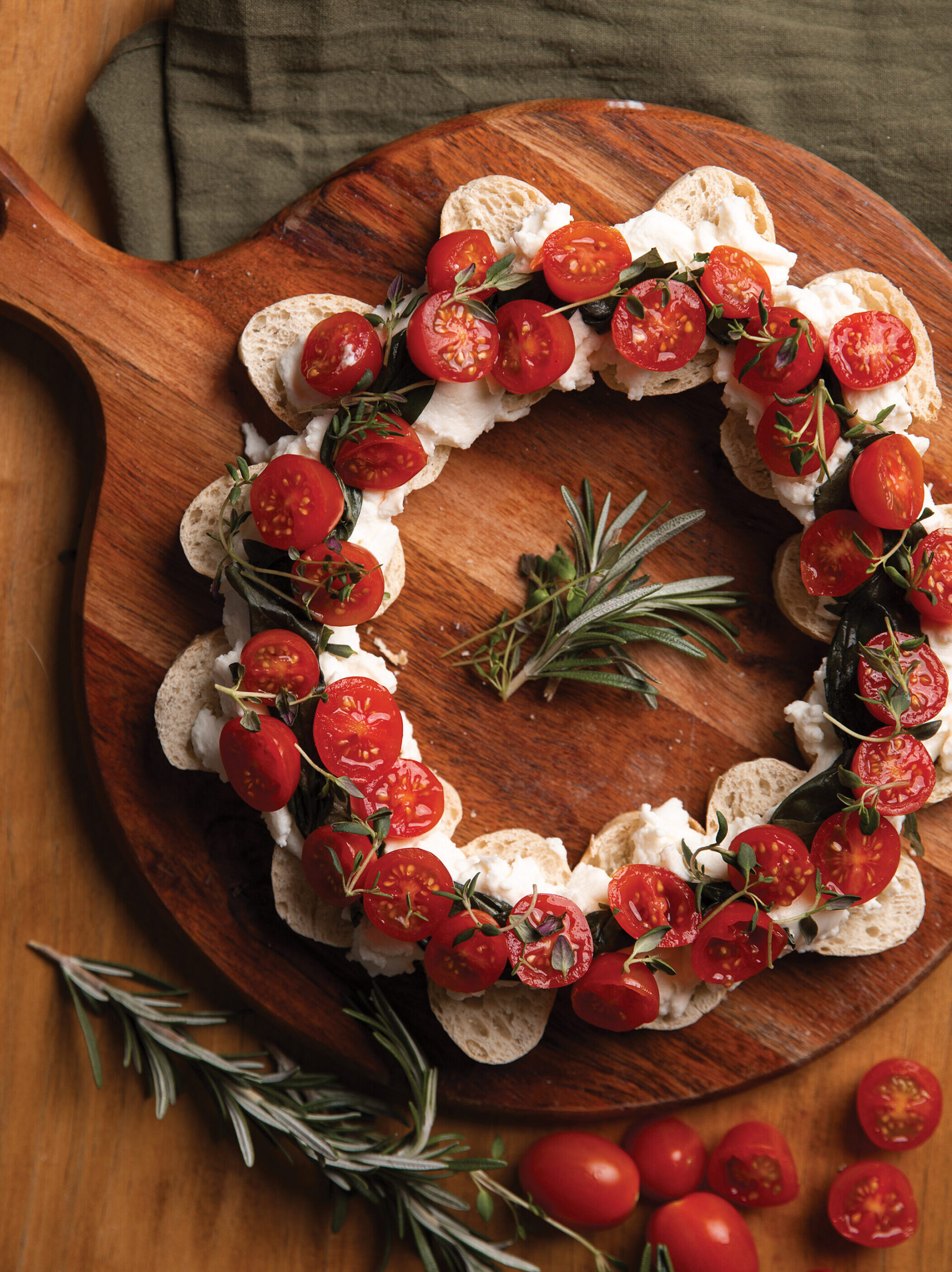 Styled by Kate Ashley | Photography by Kelly Moore Clark The Christmas Bruschetta Wreath is a festive ring of toasted baguette topped with bright Roma tomatoes and fragrant rosemary. WHAT YOU NEED:4 ripe Roma tomatoes, diced1/4 cup fresh basil leaves, finely chopped2 garlic cloves, minced2 tablespo...