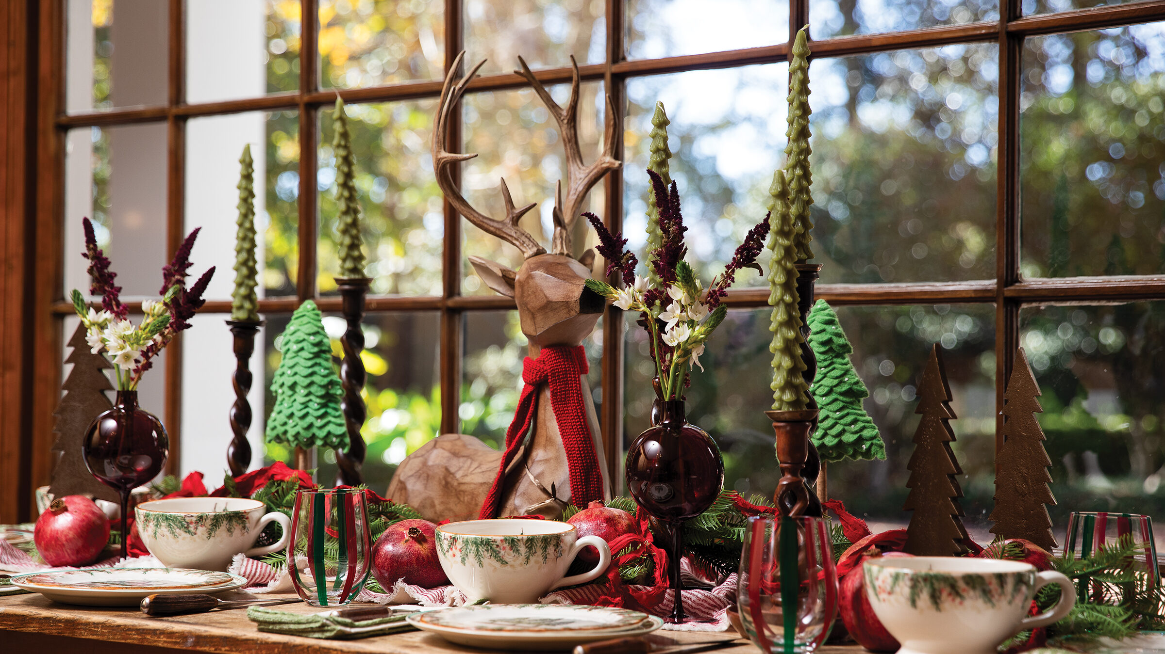 Styled by Maré Brennan | Photography by Kelly Moore Clark Casual Christmas Eve supper traditions deserve a table setting that reflects the wonder of the season. One of Santa’s reindeer takes the night off and becomes a centerpiece. Whimsy abounds with multiple sizes of antique barley twist candlesti...