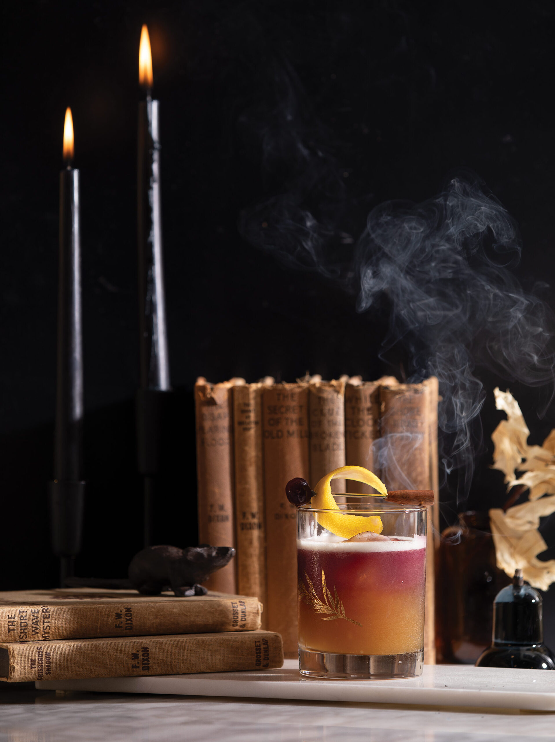 Photography by Kelly Moore Clark Gotham City vibes abound in this smoky sweet twist on the whiskey sour. A few sips in and you know you can settle in to fall. WHAT YOU NEED:2 ounces whiskey1 ounce lemon juice, freshly squeezed3/4 ounce simple syrup1 egg white1/2 ounce red wine DIRECTIONS:Combine the...