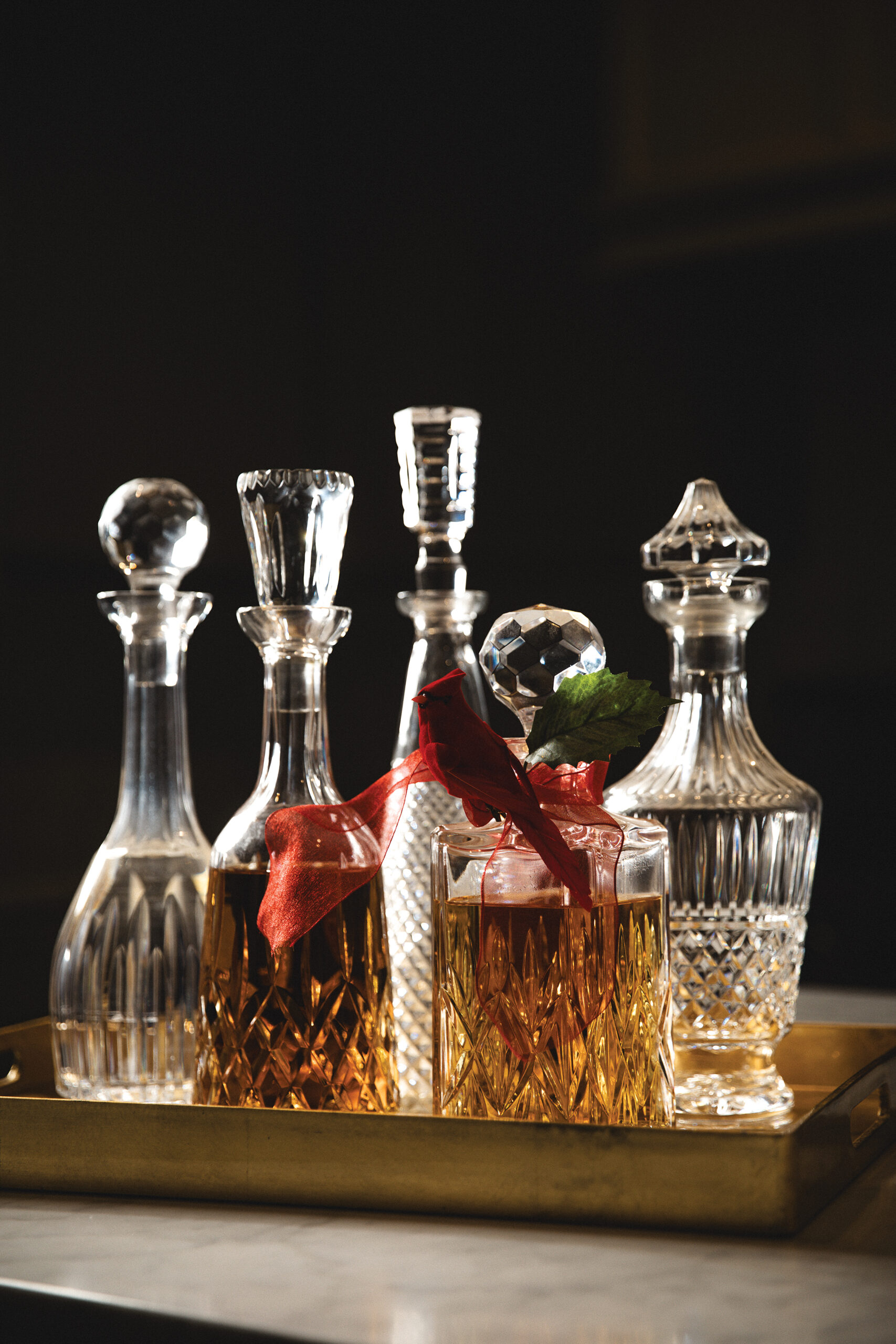 Nothing says holiday entertaining like your favorite spirits displayed in a collection of crystal decanters. Waterford Crystal decanters are displayed with an antique cut crystal decanter from the late 1800s.