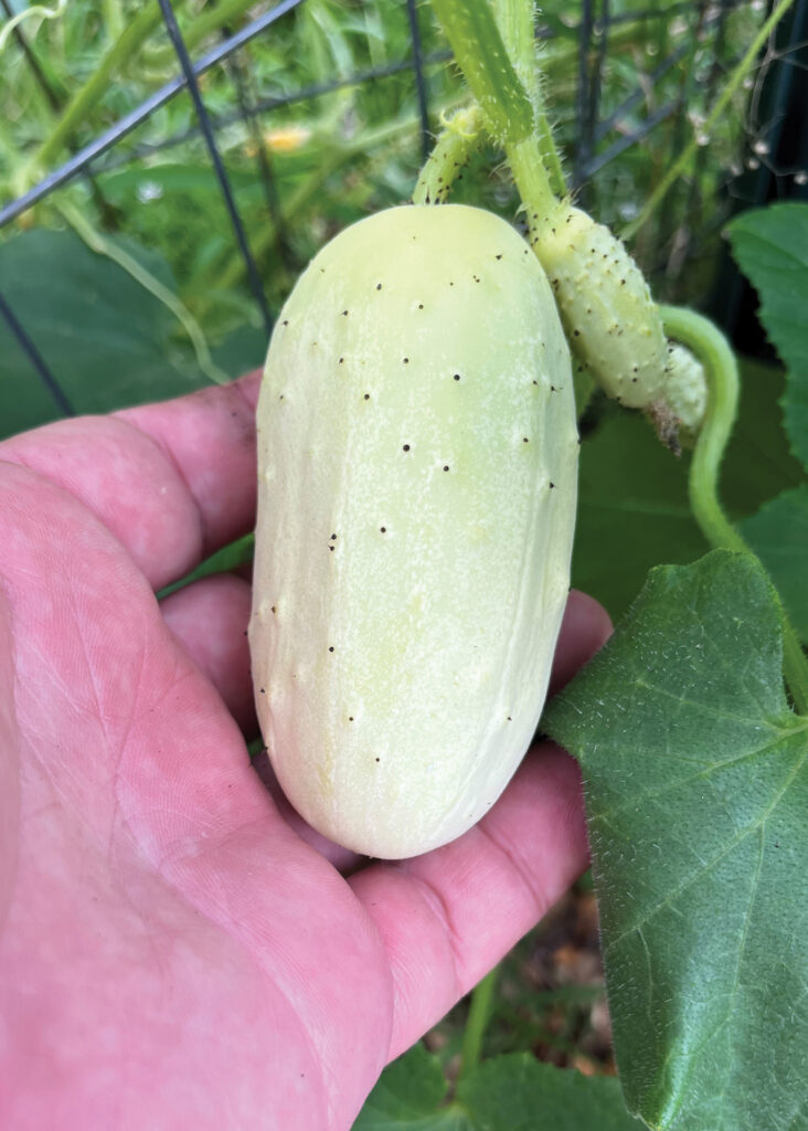 Cucumbers, snapbeans, butterbeans, English and field peas, okra, squash, tomatoes, and watermelons are all examples of fruit.  They begin as the ovary of a flower.  Rule of thumb: fruit should stay attached to the plant for as long as possible.  Inside each ovary are ovules that contain an egg cell.  At the times of pollination and fertilization, the ovary expands into a fruit and the ovules inside the ovary become seeds.  Seeds are attached to the interior of the ovary by a strand of tissue called a funiculus.  The seeds and fruit will continue to draw nutrients from the plant for as long as necessary.  A fruit is “ripe” when the seeds are mature enough to be dispersed.  Remember, flowering plants do all this to reproduce.  Not to please or feed us.  We happen to reap the benefits.  The process of flowering, fruiting, and setting seeds can be an energy drag on the plant which is why many vegetable plants stop producing if they aren’t picked regularly.  Sometimes, we pick veggies (= fruit) before they’re fully ripe.  This is the case with cucumbers.  Cukes aren’t palatable when they’re fully ripe.  But the seeds don’t mature until they’re fully ripe.  Beans and peas are other examples.  So, if saving seeds is the goal, then the seeds need to draw nutrients from the plant for as long as they can.