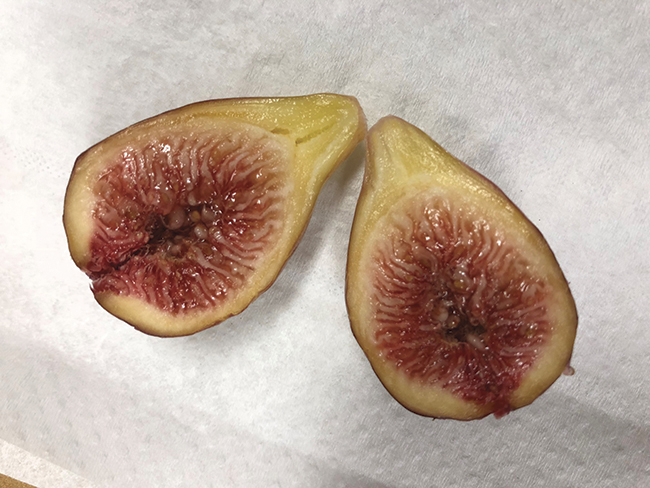 Botanically, figs aren’t true fruit. That is, they’re not derived from the ovary of a flower. Rather, the structure we call a fig is a cluster of inverted flowers called a “syconium.” In its native range, a tiny wasp called a fig wasp (Blastophaga psenes) enters the syconium through a pore called the “ostiole” or eye and pollinates the unisexual flowers on the inside. After pollination, the syconium swells and matures into a ripened fig. Fig wasps don’t occur in our part of the world, so we grow “parthenocarpic” varieties. That is, our fig varieties form fruit without needing pollination. Also, most of our fig varieties are “closed-eye” varieties where the ostiole is never open to the outside world. In “open-eye” varieties, the ostiole opens as the fig swells and ripen allowing various tiny insects to enter and potentially cause premature fruit spoilage. Depending on variety, figs may produce two crops of fruit. The early crop is referred to as the breba crop and is produced on last year’s wood. The main crop, which we typically harvest from July to August, is produced on current-year’s growth.