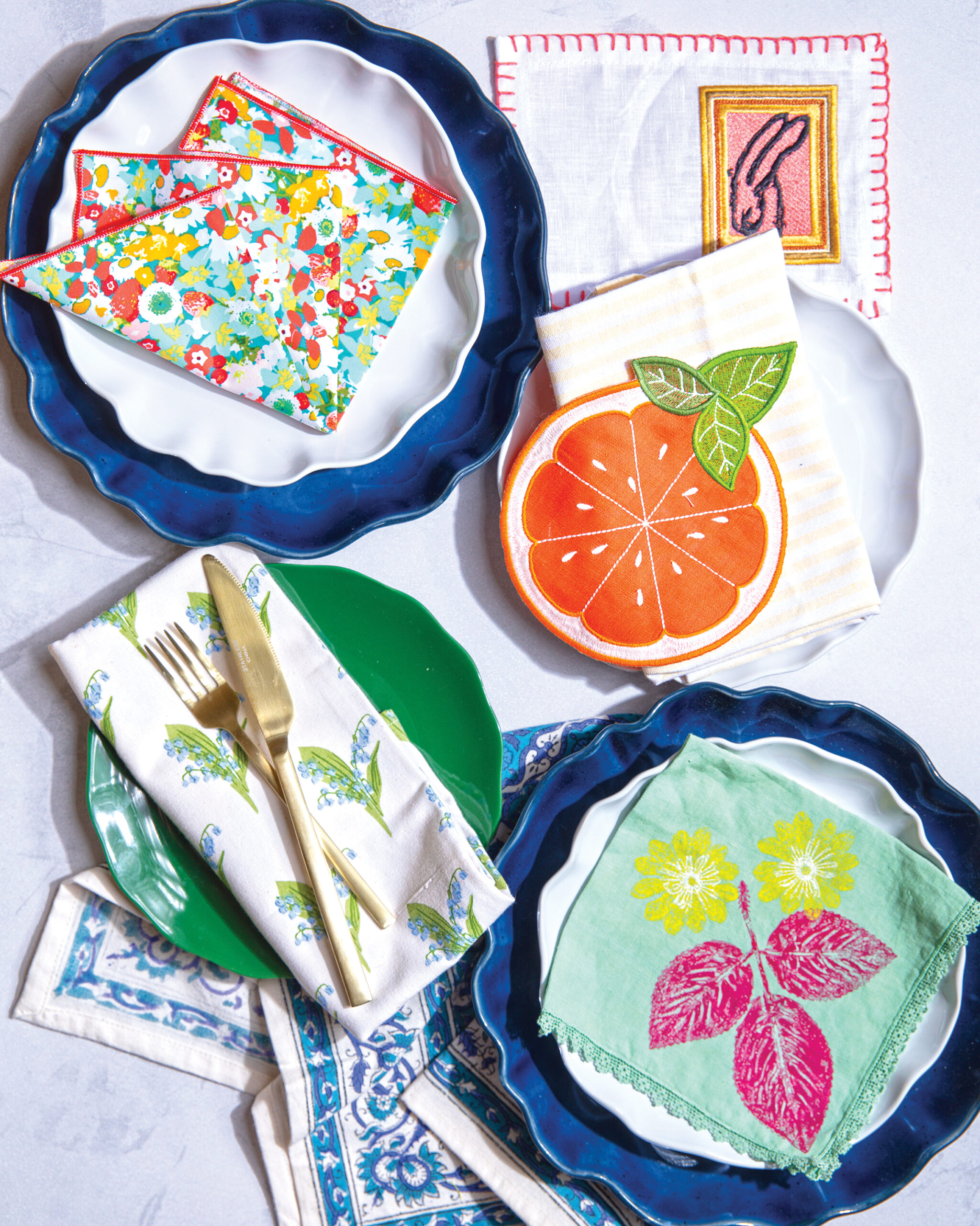 Clockwise from top: multi-colored floral napkin from Revival Design & Consign, Hunt Slonem bunny from Material Things, striped napkin from Gypsy Soul, orange slice from Palette House, floral stamped napkin from The Trove, blue floral napkin from Walsworth & Company, bluebell florals Lauren Roebuck Designs.