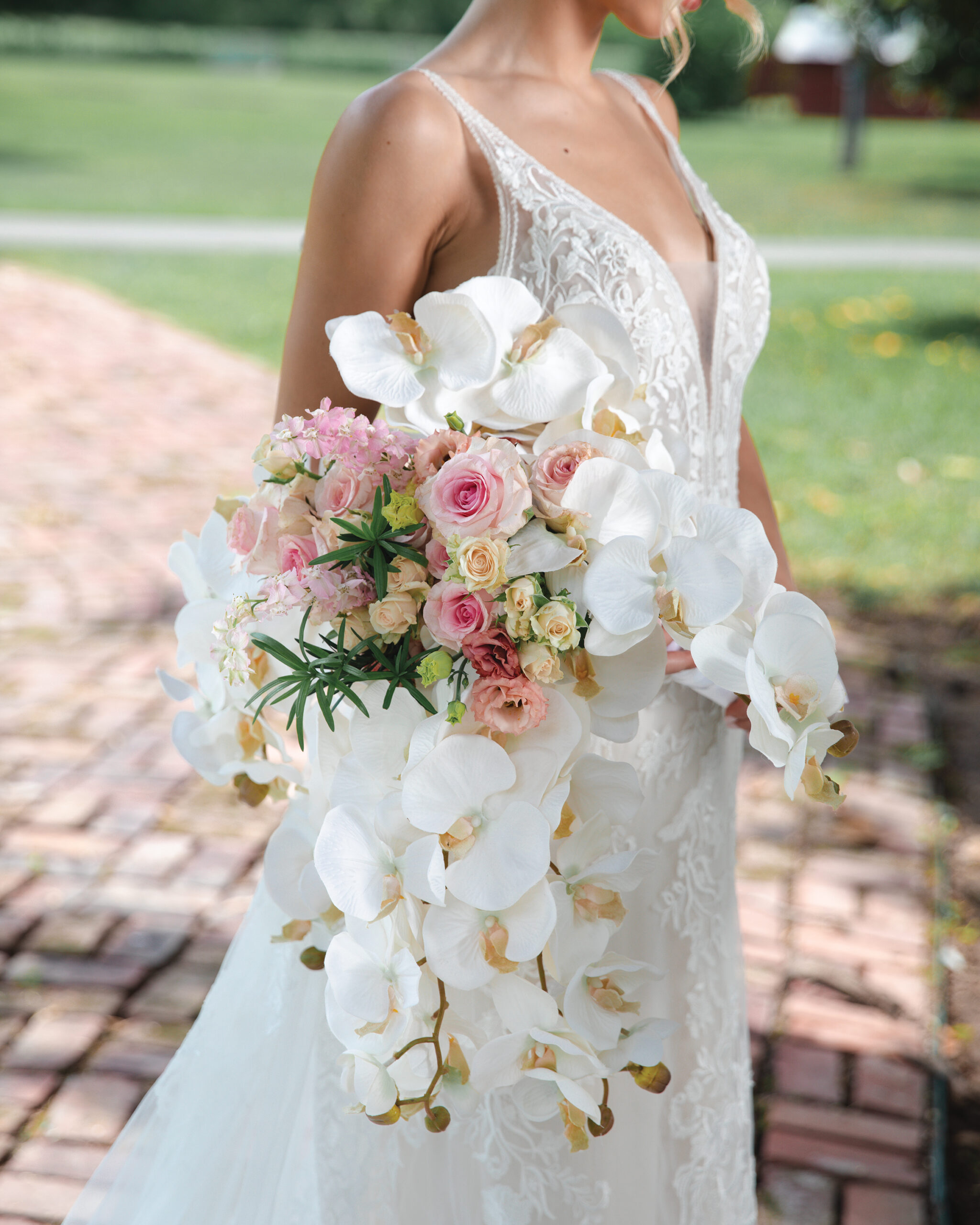 Clint Downing of Revival Design & Consign created an exquisite wedding bouquet by artfully combining cascading silk orchids with garden and spray roses.