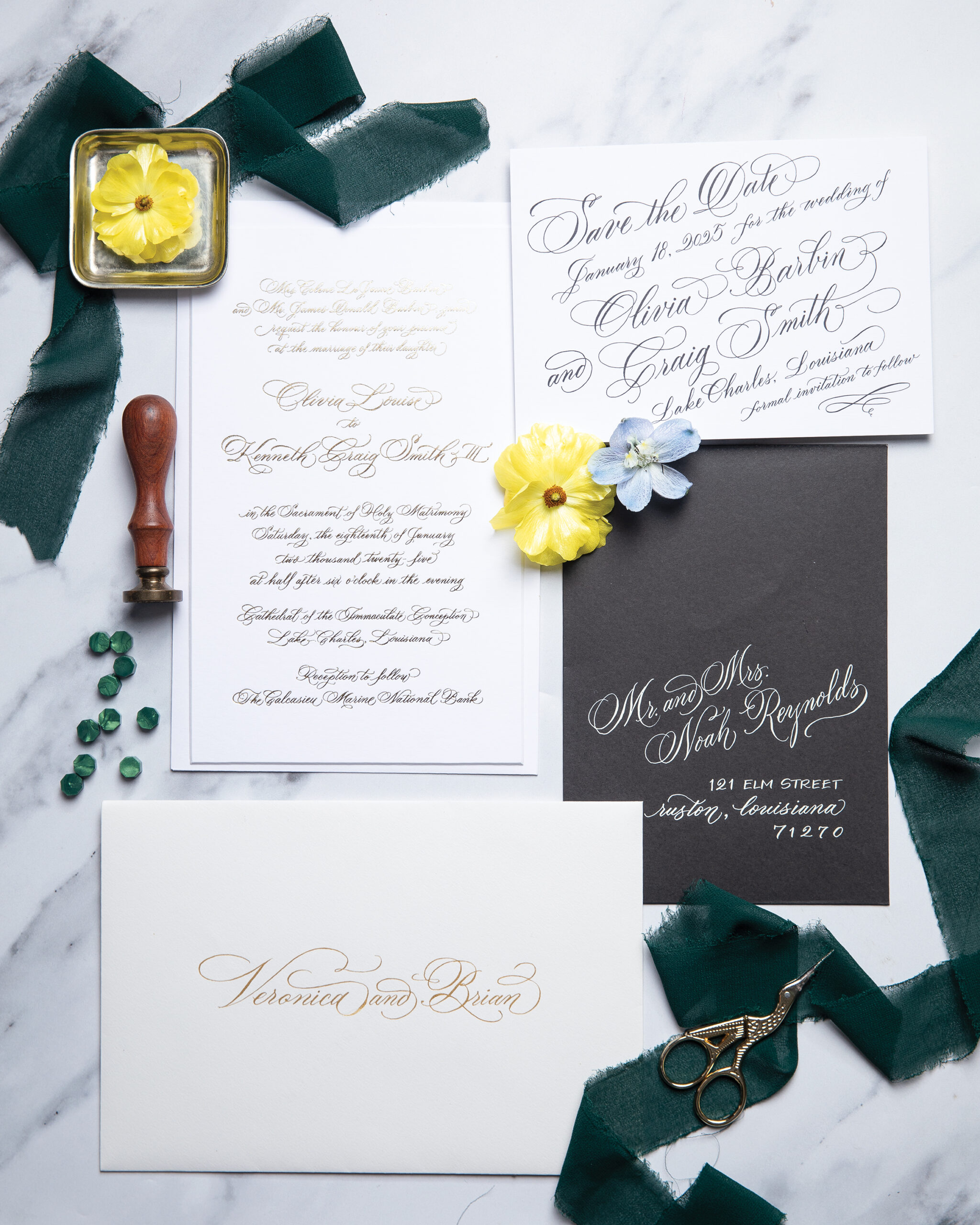 Paperglaze Calligraphy is known for creating classic suites with beautiful hand-lettered invitations. This white and black “Save the Date” perfectly complements the hand-lettered gold wedding invitations with classic calligraphy.