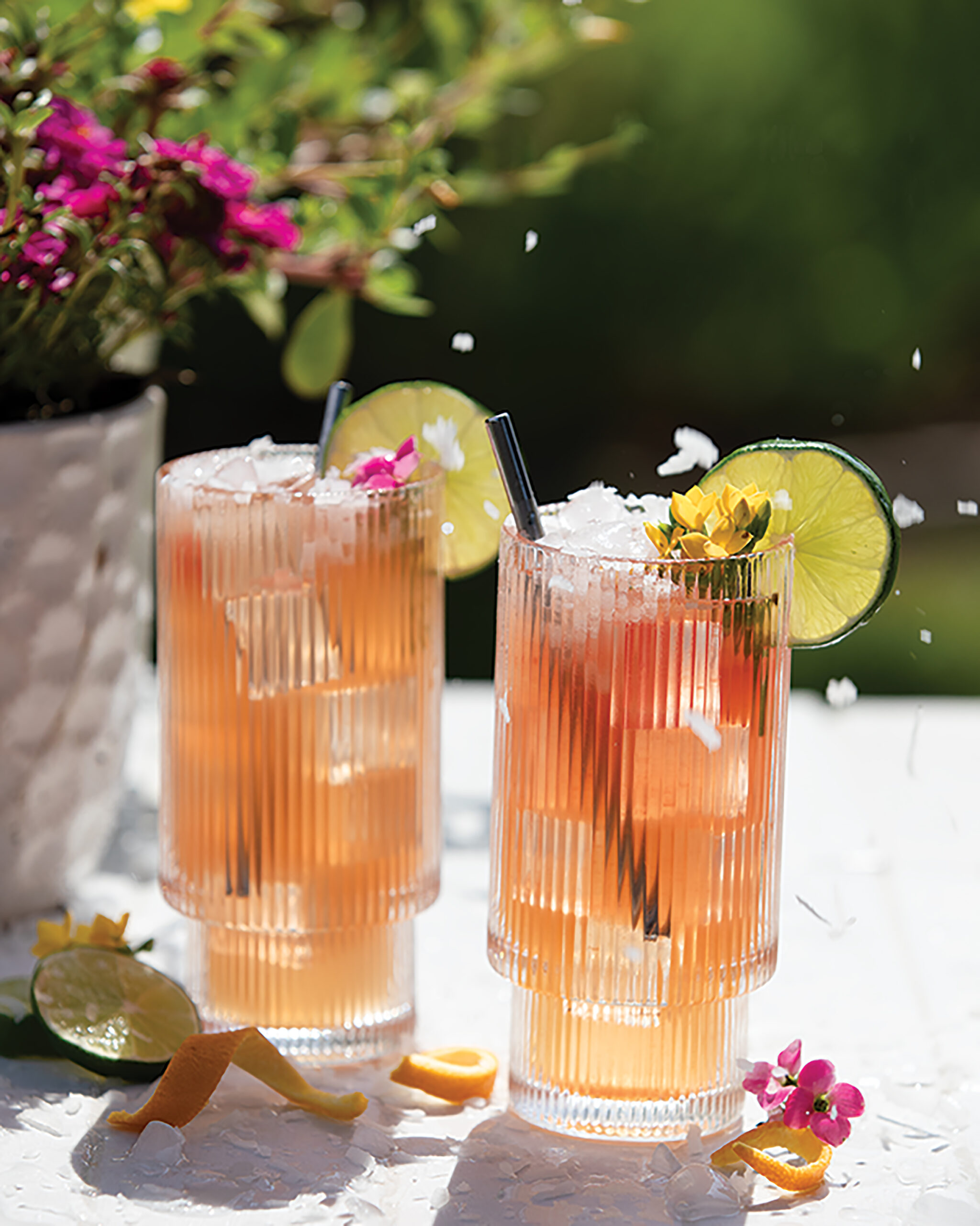 Combine all the juice in a mixing glass and stir well to combine. Pour over ice and add a splash of grenadine. Add limewheel, shredded coconut and edible flowers for garnish.