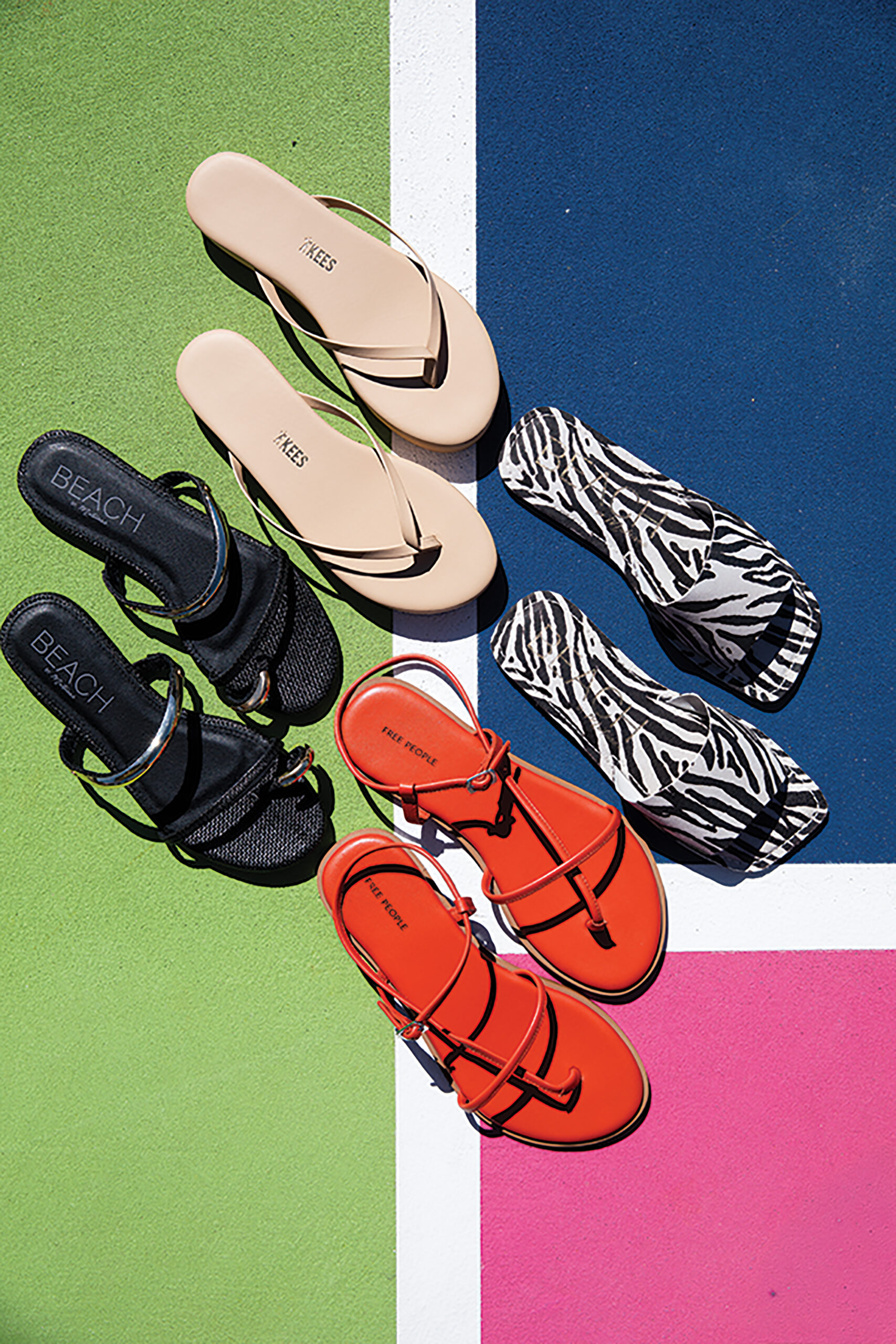 TKEES neutral sandal and bold orange Free People sandals available at HEMLINE MONROE. Zebra print flats and Beach black and metallic sandals available at HERRINGSTONE’S.